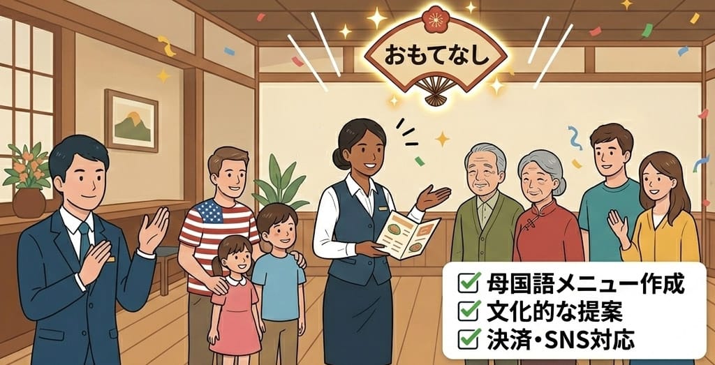 - ② 圧倒的な「SNS・口コミ」拡散力: 「自分の言葉で最高の接客を受けた」という体験は、GoogleマップやTripAdvisorへの高評価に直結します。母国語での好意的なレビューは、次の外国人客を呼び寄せる最強の広告になります。