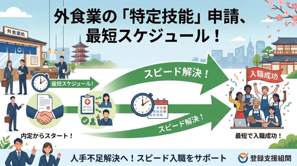 人手不足が深刻な飲食店にとって、採用後の「空白期間」は死活問題です。特定技能(外食)の採用は、日本人やアルバイト採用とは異なり、複雑な行政手続きがいくつも重なります。しかし、「どの手続きに時間がかかるのか」を正確に把握し、同時並行で進めることで、入職までの期間を大幅に短縮することが可能です。